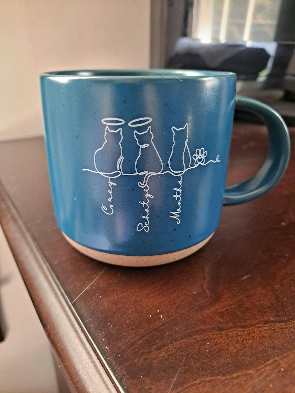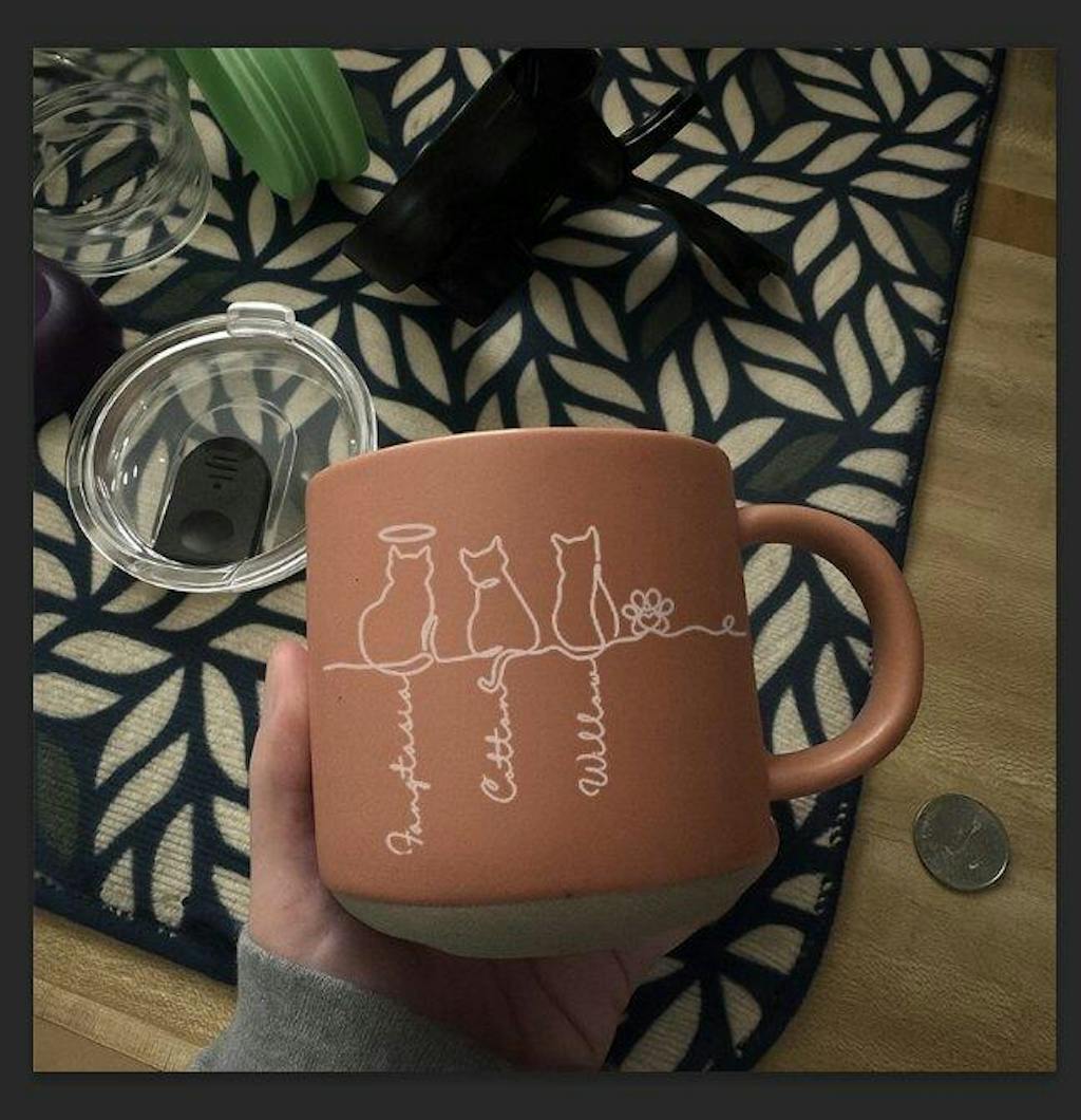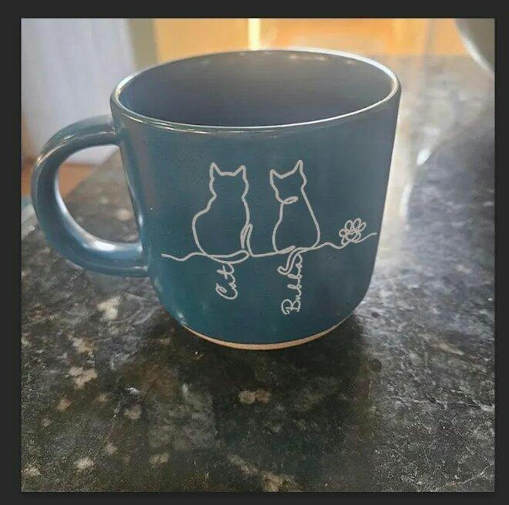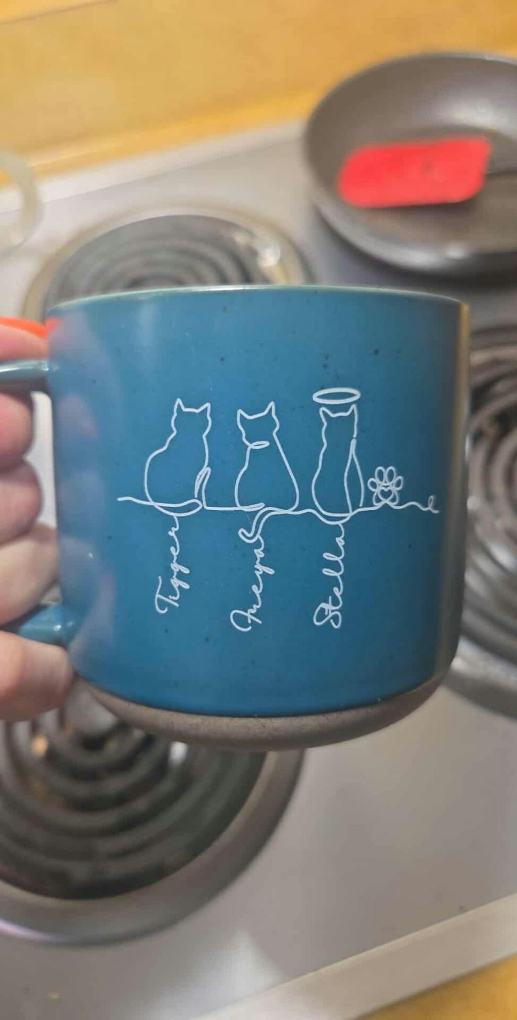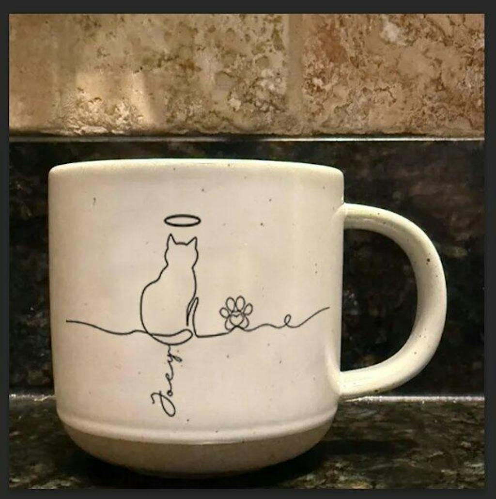 The mug is perfect. My niece LOVED it as a surprise Birthday gift. It’s very well crafted. Heavy and she loved the shade of blue. She was so happy to have all three of her cat kids on one mug! Me, not ever being a pet owner, didn’t think much about the Halo and decided to put it over the first cat she got of the three. She asked me,”why Stella;” and I explained … and she said, “But Stella isn’t dead.” We still love the mug and Stella is a special cat. Two other women I polled in my office immediately thought that’s what the halo indicated..,that the cat had crossed over the rainbow bridge and no longer living.
